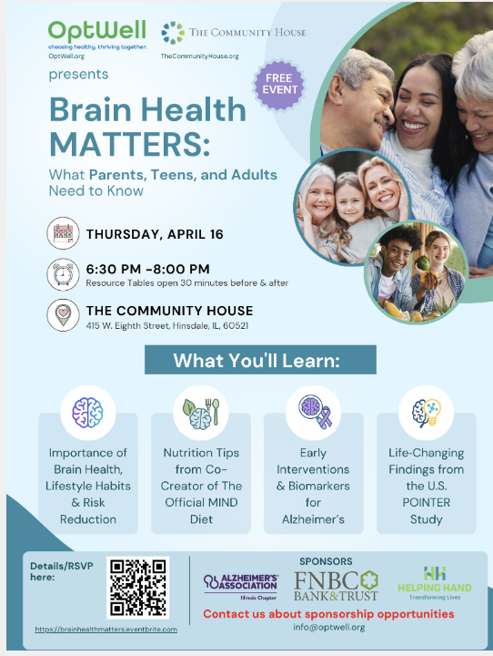 Optwell Presents: Brain Health Matters Thursday, April 16, 2026 6:30 PM 7:30 PM Google Calendar ICS Chicago Friends!It’s never too early or too late to adopt brain-healthy habits.Learn practical, science-backed lifestyle habits from trusted experts—including the co-creator of the Official MIND Diet—that support brain and whole-body health at every age.The event is free and open to the community. Register Here